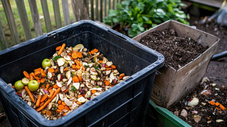 veggie and fruit scraps being composted for use in gardens, created with generative ai