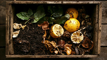 A wooden box filled with fresh organic compost, featuring citrus fruits and leafy greens, showcasing sustainable gardening practices and composting methods.