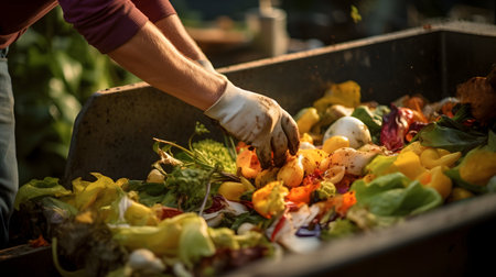 A person in protective gloves adding food waste to an outdoor compost bin. Concept: sustainability and environmental responsibility, the practice of composting,
