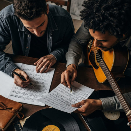 High angle top-down editorial photograph capturing two professional musicians collaborating intensel
