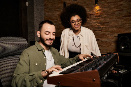 A man and a woman, musicians, collaborating on a music band rehearsal in a professional recording studio.