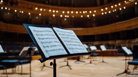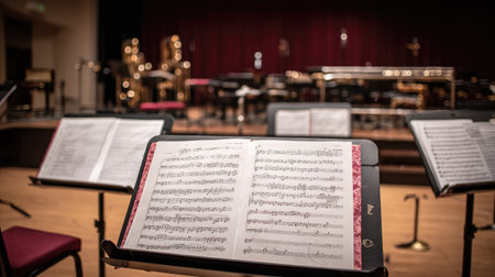 Orchestra pit view showing music stands, sheet music, and conductor's podium