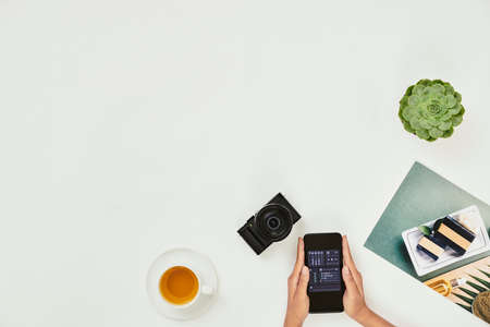 Close-up of female hands holding mobile phone with settings on the screen while sitting on the white table with digital camera and cup of tea