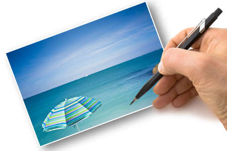 Unrecognizable tourist holds postcard in front of natural landscape. AI generated illustration