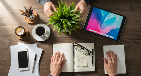 A person's hands are visible working at a wooden desk with a tablet, notebook, coffee, and plant. Sunlight streams in.