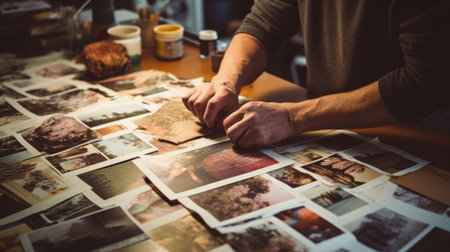 creative workspace photographer sorting vintage pictures