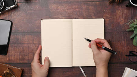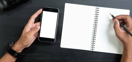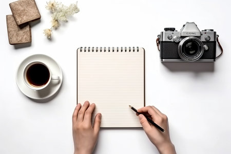 Overhead shot of male taking note on blank notebook on white office desk with computer device, camera and coffee cup