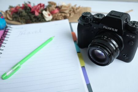 Top view of worktable with laptop, camera, notebooks and copy space in office room