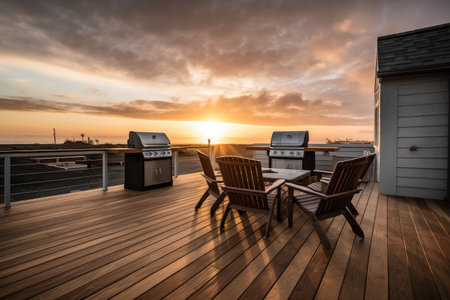 deck with built-in grill, lounge chairs and view of the sunset, created with generative ai