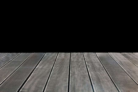 Empty perspective wooden decking or flooring isolated on black background. For montage product display.