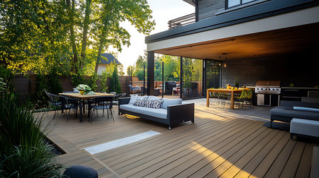 The exterior of a back garden patio area with wood decking. Generative AI technology