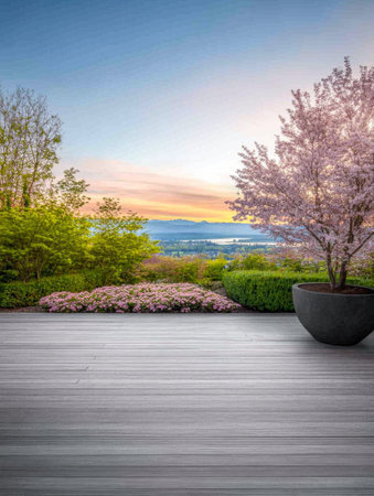 This image captures a serene backyard deck surrounded by lush greenery and vibrant flowers under soft sunlight, creating a peaceful outdoor retreat.