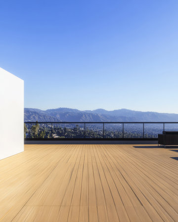 A spacious wooden terrace overlooks distant mountains under a clear blue sky. The area features minimalist design elements with a modern touch perfect for relaxation and gatherings.