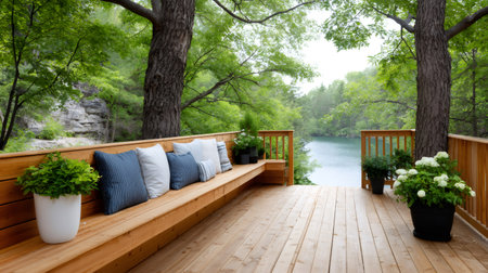 Wooden deck with a built-in bench and pillows, providing a peaceful nature getaway view