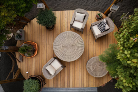 A serene top view of a wooden deck featuring fresh green foliage, creating a tranquil outdoor environment ideal for relaxation and leisure activities.