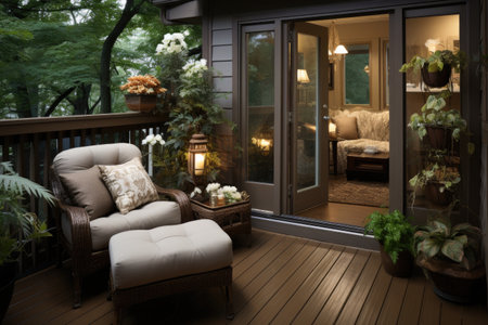 cape cod house exterior with wooden deck and outdoor furniture, created with generative ai