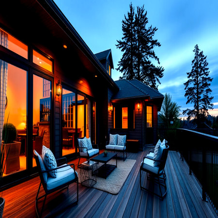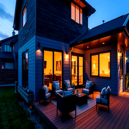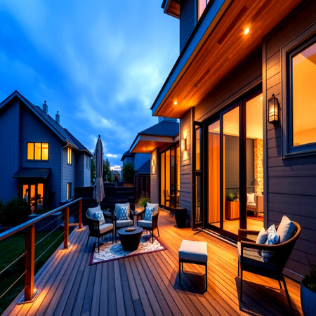 Outdoor patio with patio and deck at twilight. Northwest, USA