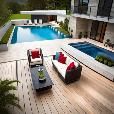 Swimming pool and decking in the garden of luxury home. Generative AI