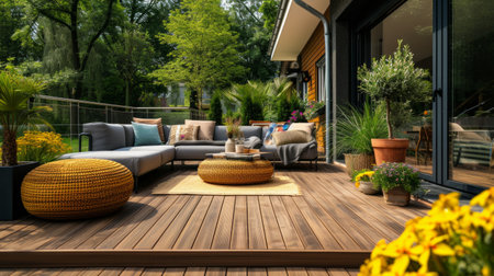 Beautiful outdoor decking made from reclaimed timber, blending with natures palette for sustainable living. AI generated.