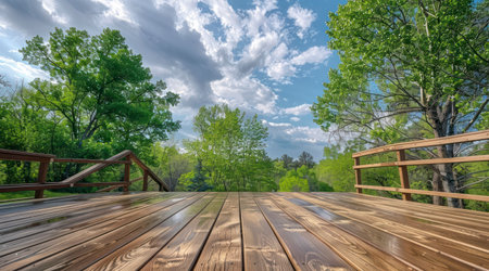 The Natural Beauty of a Wooden Deck Framed by the Soft Palette of Cloudy Skies and Greenery