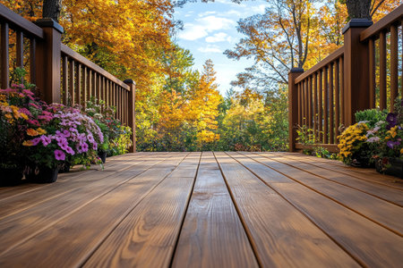 Empty wooden deck with railing and potted flowers, surrounded by colorful autumn foliage, creates a peaceful and inviting outdoor space