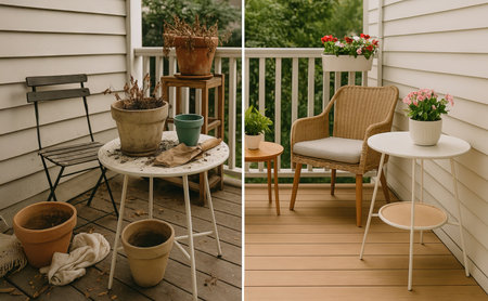 Before and after of terrace cleaning with cluttered garden tools and planters turned into serene tidy sitting space. Concept of outdoor makeover, home care, garden tidiness, relaxation area.