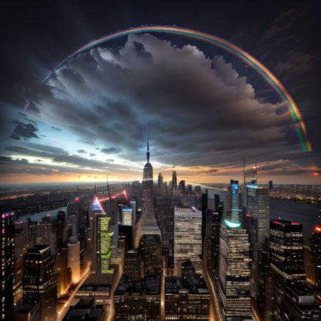 Discover a breathtaking perspective of a vibrant urban skyline bathed in golden light. This stunning composition captures the essence of city life at twilight, showcasing a beautiful interplay of lights and architecture.