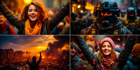 Collage of 4 photos. Artistic depiction of a busy city square filled with people. Created using artificial intelligence algorithms. Conveys the energy and movement of a large crowd from above.
