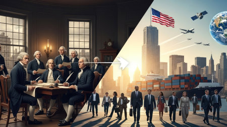 This composite image contrasts a historical meeting with a modern business scene. The left side features figures gathered indoors, while the right side depicts a contemporary cityscape with business professionals. The composition incorporates diverse elements, suggesting themes of evolution, leadership, and economic development for potential commercial applications.