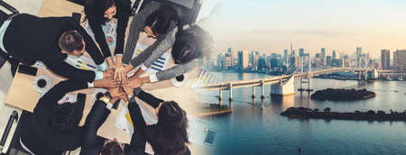 Happy business people celebrate teamwork success together with joy at office table shot from top view . Young businessman and businesswoman workers express cheerful victory in broaden view .