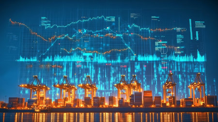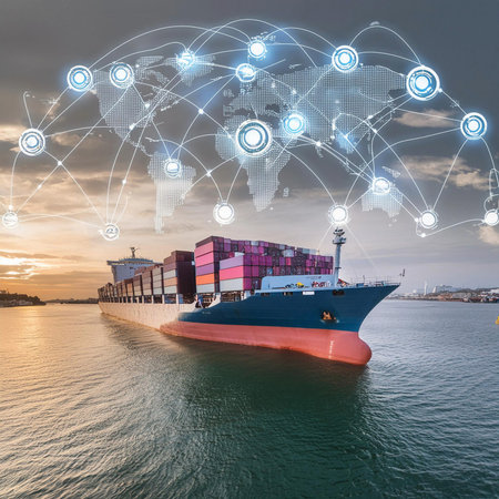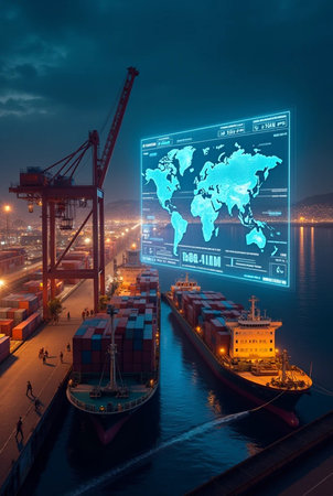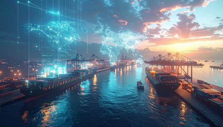 A cargo ship navigates a busy harbor, its hull overlaid with a digital map of the world, highlighting the interconnectedness of global trade.