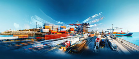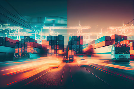 cargo port with blurry, fast-moving cars and trucks for double exposure effect, created with generative ai
