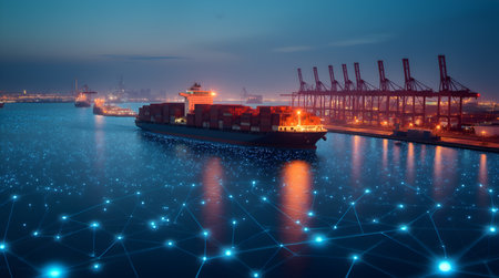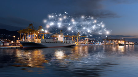 A serene nighttime view of a bustling port with a container ship, illuminated by lights, showcasing technological connectivity over water surfaces.