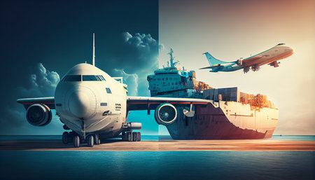 A cargo plane and a shipping vessel transporting goods under a sunny sky, representing global trade and logistics.