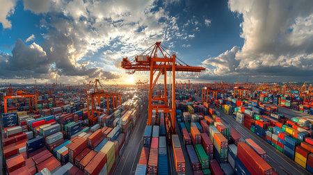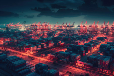 An extensive aerial view showcases a bustling container port, a vital hub for global trade. Rows upon rows of stacked shipping containers fill the landscape, meticulously organized. Large cargo ships are docked, and towering cranes are actively engaged in loading and unloading operations. The industrial complex stretches across the water, highlighting the immense scale and intricate logistics involved in international commerce and transportation. The scene conveys a sense of organized...