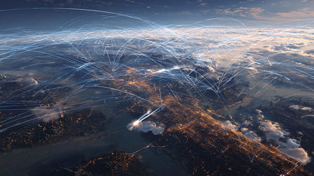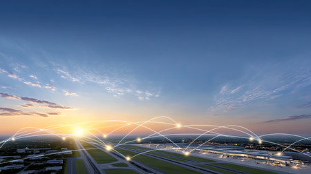 A breathtaking aerial view of an airport at sunset, showcasing a network of light nodes. This image represents global connectivity and the dynamics of travel and communication.