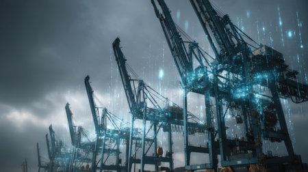A stunning industrial harbor scene featuring cranes with digital effects, set against a moody cloudy sky, evoking a sense of futuristic logistics and maritime activity.