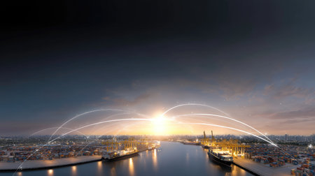 A stunning view of bustling port at sunset, showcasing numerous shipping containers and cranes. scene is enhanced by glowing lines representing global connectivity and trade
