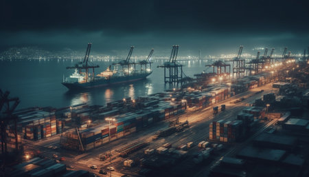Container ship unloading heavy cargo at dusk generated by artificial intelligence
