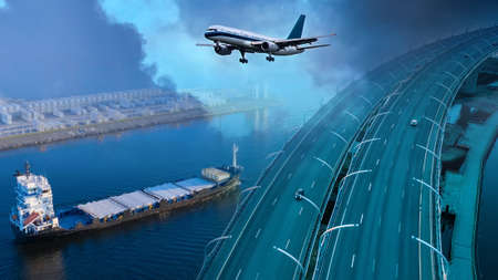 Transportation. Various modes transport nearby. Cargo ferry is sailing next to road. Plane. Transportation by water, air and land. Concept - various types of transportation of goods. Logistics business