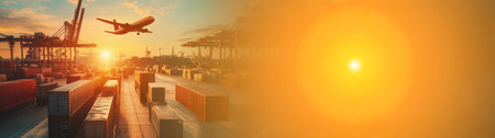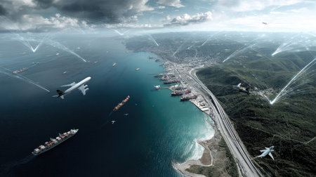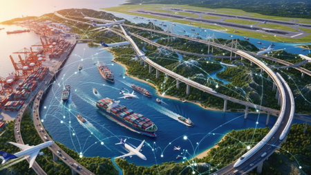 An overhead view reveals a complex transportation network featuring cargo ships, airplanes, and roadways. The composition highlights a coastal area, with containers and vehicles. The digital illustration showcases connected infrastructure against a bright, sunny environment, suitable for various commercial uses.