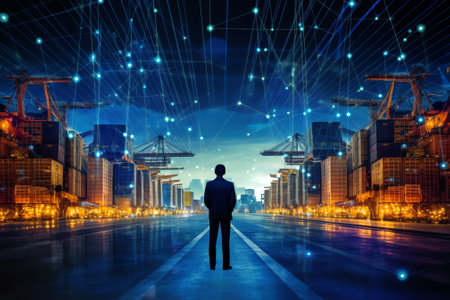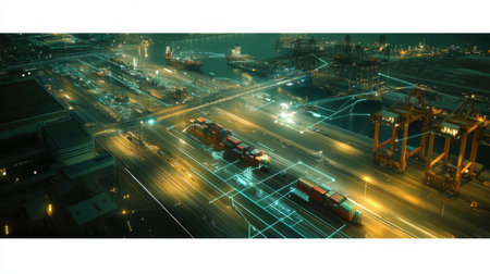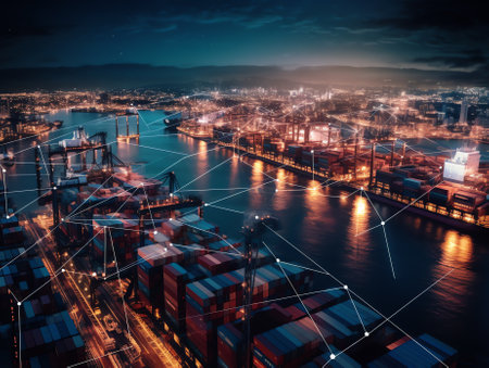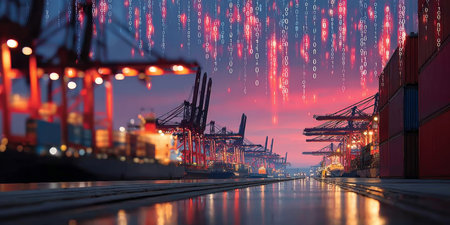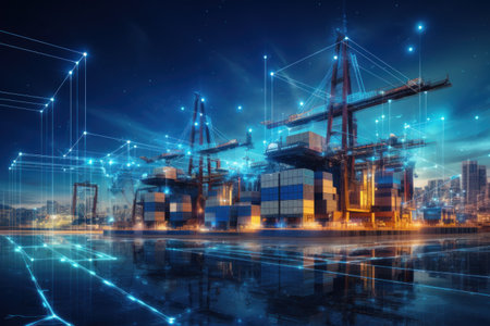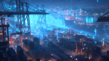 A captivating nighttime scene of a bustling port with towering cranes and shipping containers, enhanced by a digital overlay symbolizing connectivity and technology.