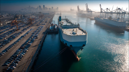 Aerial view of vehicle carrier ships docked in a harbor, with vast stockpiles of new cars ready for transport and a distant city skyline on a hazy day.