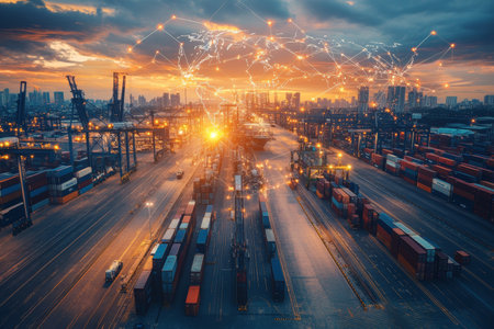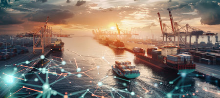 A stunning aerial view of a busy container port during sunset, showcasing cargo ships and vibrant city skyline with digital network lines symbolizing connectivity.