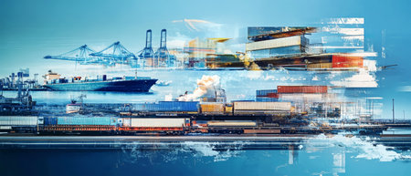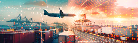 A dynamic collage showcases cargo ships, trains, and trucks operating in a seamless flow, surrounded by data streams connecting the world of transportation.