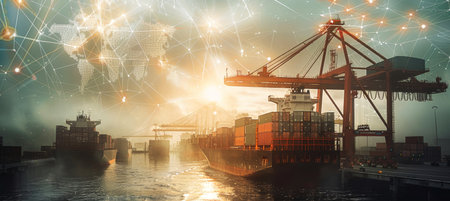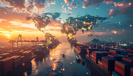 A cargo ship navigates a busy port at sunset with cranes and other vessels in the background. A digital map overlays, illustrating global trade links.