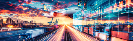Double exposure of Industrial Container Cargo freight ship, truck, aircraft for Logistic Import Export concept. Ai generative