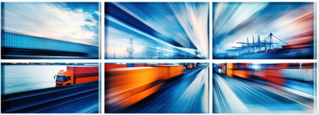 Cargo transportation comes to life with trucks, trains, ships, and planes framed in vibrant blue and dynamic motion. This artistic composition celebrates logistics efficiency.