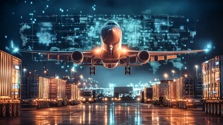 Cargo approaches airplane airport under a vibrant neon world grid, surrounded by trucks and containers reflecting the energy of nighttime freight activity.