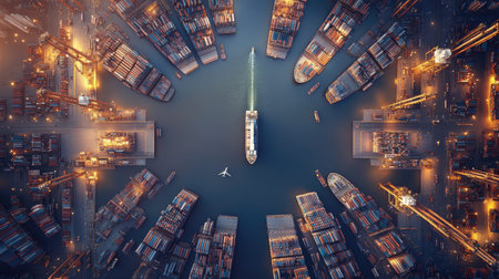 A Aerial view of a bustling maritime trade hub with a container ship and cargo vessels illuminated
